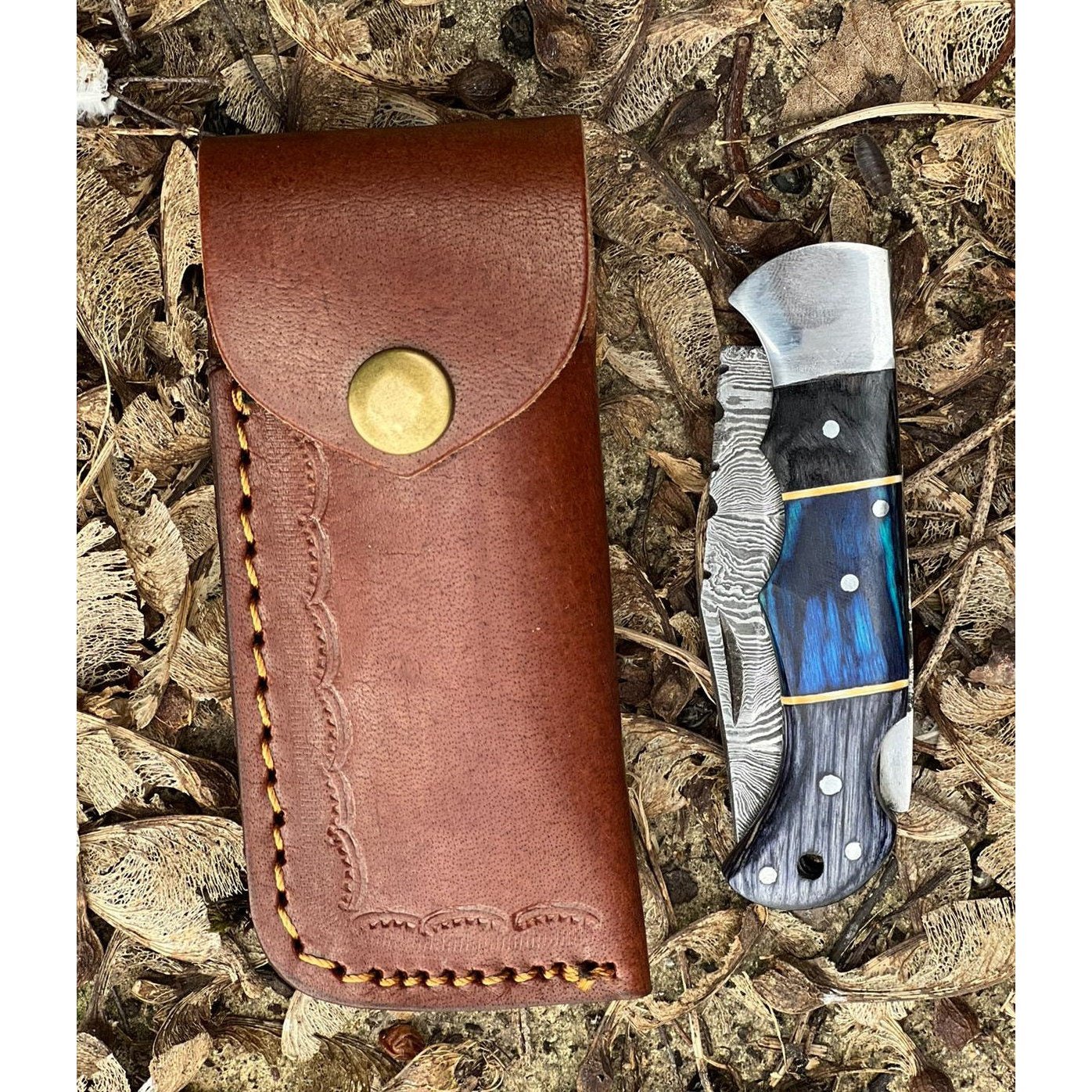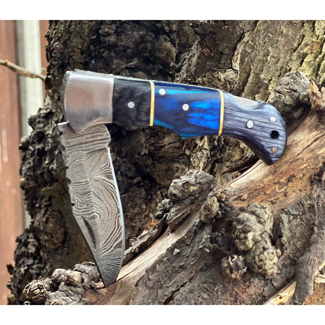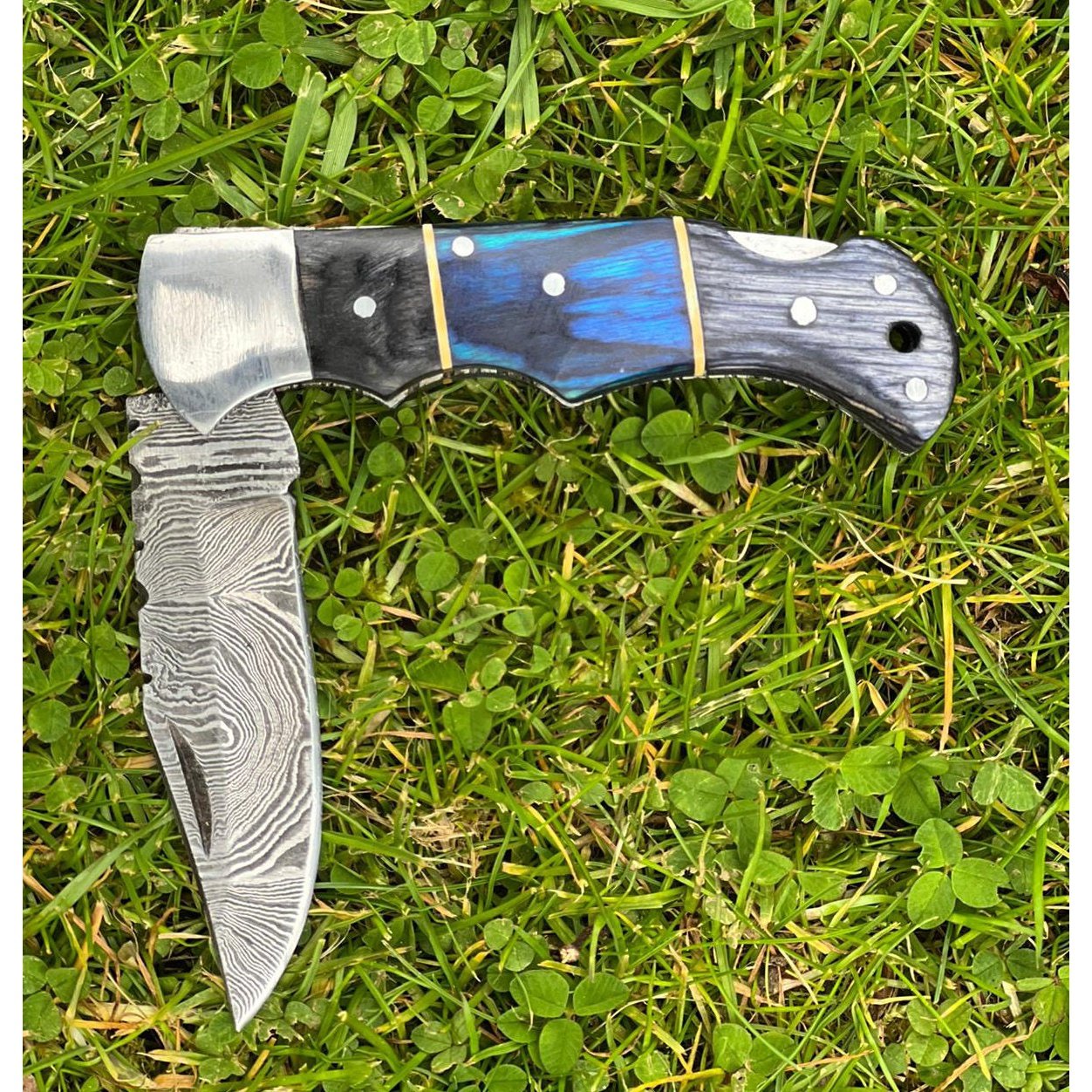 A beautifully handmade Damascus pocketknife, with a razor-sharp blade and easy to manually fold in and out. The handle is made from Stamina Wood and steel with a blue and grey colour block design. The pocketknife comes with a tan leather sheath with a flap snap button closure. This Blade comes with a button lock to close the blade. This does NOT have a quick release button. It needs to be manually opened which will lock into place and to be folded back the button at the end of the handle needs to be pressed.
