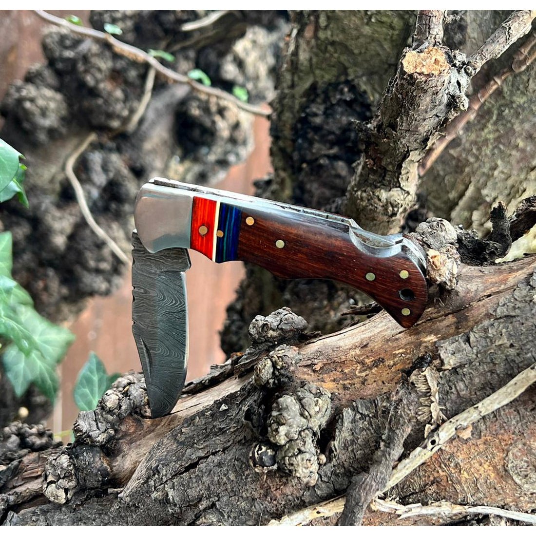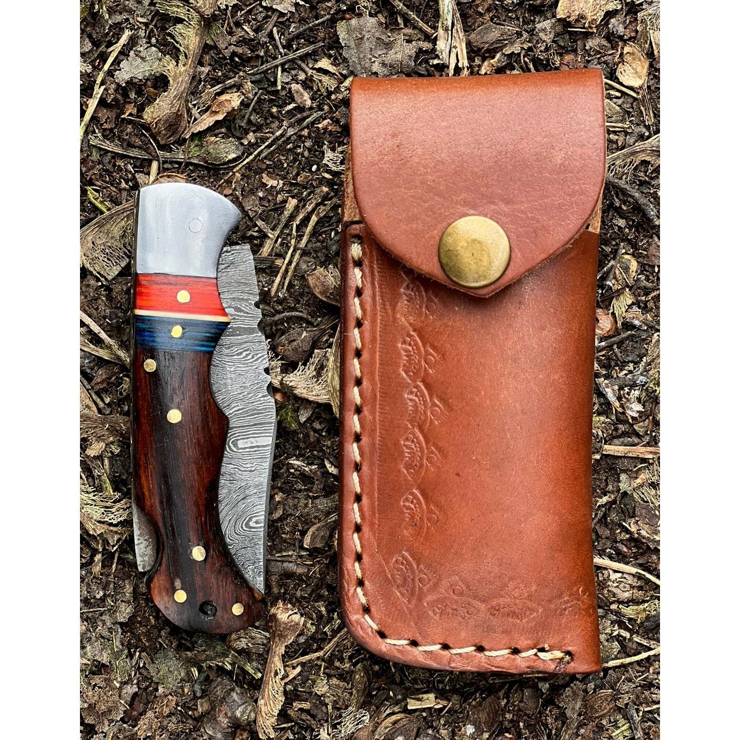 A beautifully handmade Damascus pocketknife, with a razor-sharp blade and easy to manually fold in and out. The handle is made from Stamina Wood and engraved brass with an ivory and black design. The pocketknife comes with a tan leather sheath with a flap snap button closure.