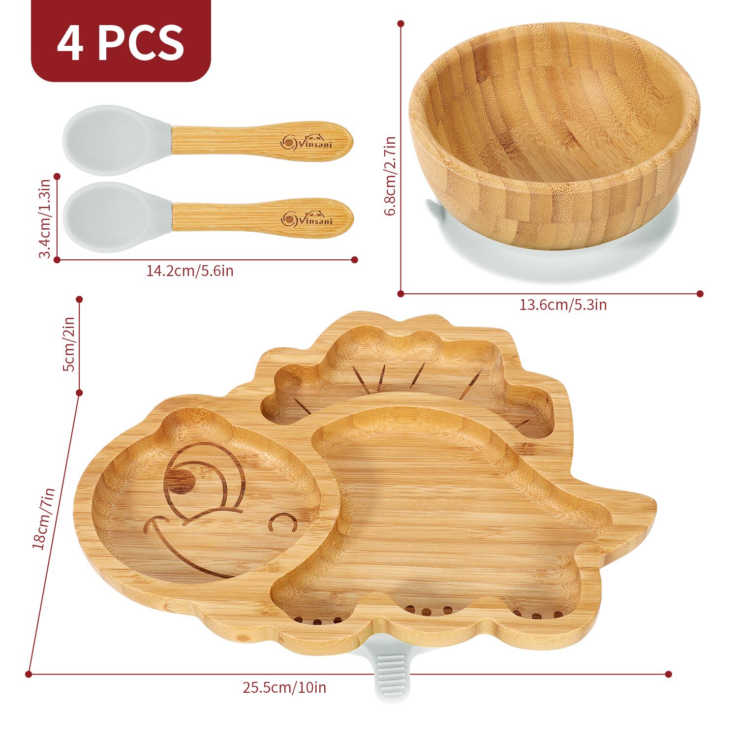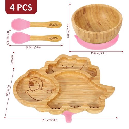 - Dimensions: Our bamboo suction plates fit most highchairs, with the plate measuring 18 x 25.5 x H 5 cm (7 x 10 x 2 in), bowl measuring 13.6 x 6.8 cm (5.3 x 2.7 in), and spoons at 14.2 x 3.4 cm (5.6 x 1.3 in).