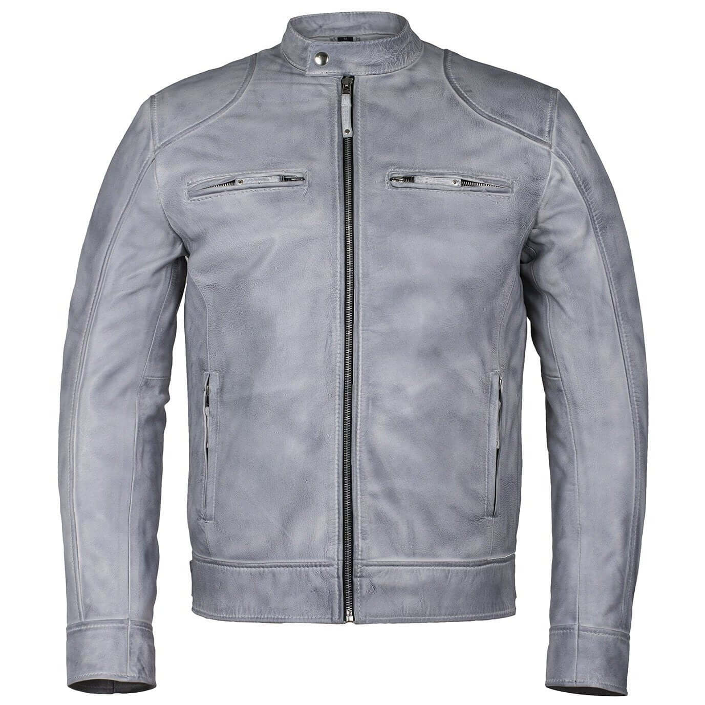 The Men's Slim Fit Sword Cafe Racer Leather Jacket in Vintage Grey combines retro-inspired cafe racer style with modern sophistication. Crafted from 100% premium soft leather, this slim-fit jacket offers a tailored silhouette that hugs the body comfortably, providing durability, style, and timeless elegance.